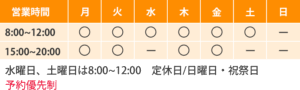 | 営業時間 | 月・火・木・金 AM8:00~12:00 PM15:00~20:00 水・土 AM8:00~12:00 |