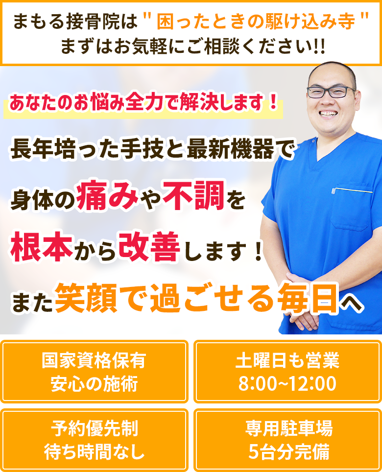 まもる接骨院なら身体の痛みや不調によって日々つらい思いをしているあなたのお悩みを解決することができます。